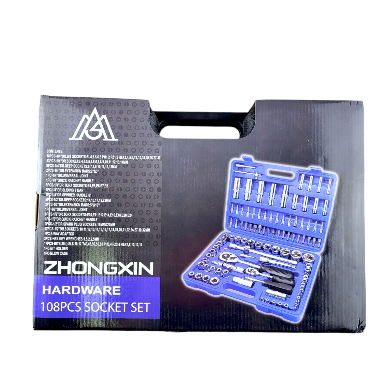 Набор инструментов в чемодане включает в себя 108 предметов и произведён специально для автомобилистов и центров технического обслуживания. Насадки, головки и комбинированные ключи изготовлены из высокопрочной хромованадиевой стали, придающей инструментам исключительную твердость в сочетании с легкостью. Набор упакован в прочный кейс с надежными застежками и изготовлен из жесткого противоударного пластика. Хромованадиевая сталь долговечна, не боится внешних воздействий и коррозии. Все инструменты имеют маркировку с размерами.