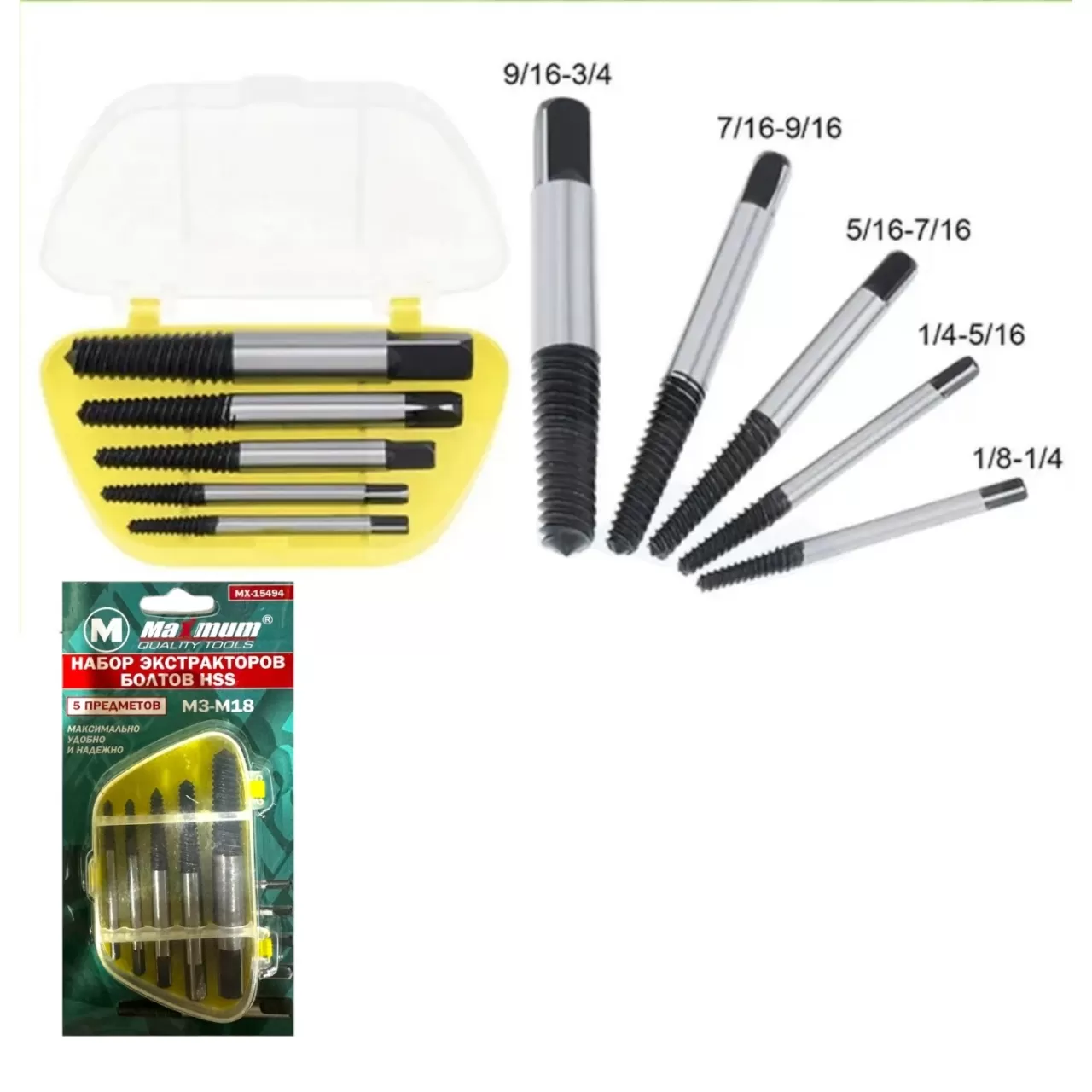 Набор экстракторов HSS «MAXIMUM» — это профессиональное решение для быстрого и аккуратного удаления поврежденного крепежа. Инструмент работает по простому принципу: конец экстрактора вкручивается в предварительно подготовленное отверстие, надежно захватывает обломок и позволяет его вывернуть без лишних усилий. Набор укомплектован 5 экстракторами разного диаметра для работы с крепежом от M3 до M18. Каждый инструмент изготовлен из высокопрочной HSS стали, что гарантирует долгий срок службы. Весь набор удобно хранить в прочном пластиковом кейсе.