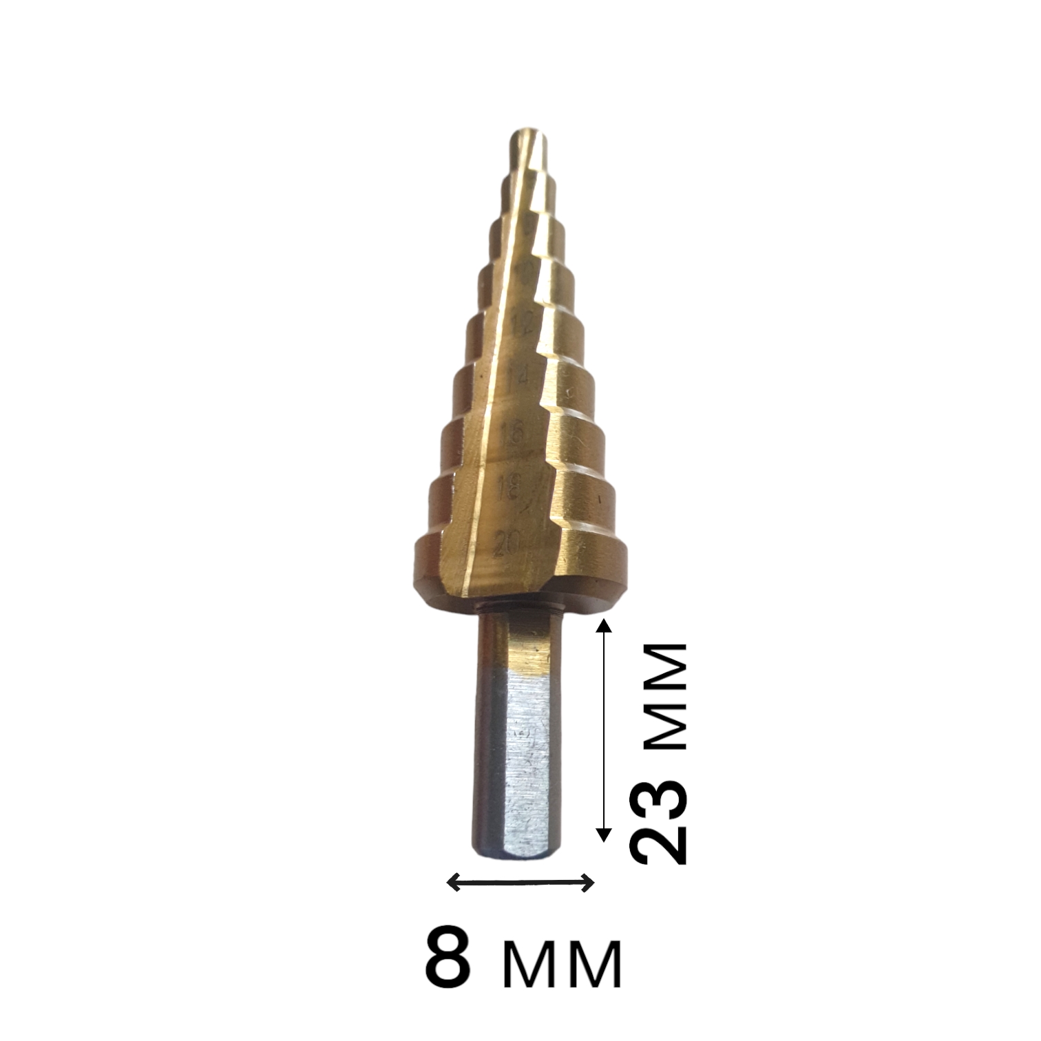 Сверло по металлу имеет 9 ступеней с шагом в 2- 3 мм, которые помогают создать оптимальный и точный размер отверстия. На каждой ступени есть маркировка фактического диаметра. Популярной сферой использования ступенчатого сверла по металлу является шлифование уже готового отверстия.